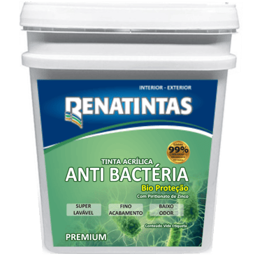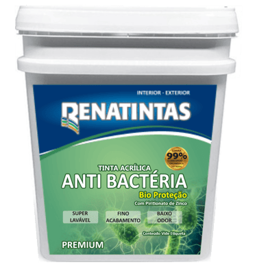 Tinta Acrílica ANTI BACTÉRIA Premium, é um produto com fórmula inovadora, e contém poderoso Biocida que age na película seca da Tinta prevenindo contra a proliferação de fungos e bactérias, recomendada para banheiros, cozinhas, saunas, lavanderias, garagens, telhas de fibrocimento, indústrias, hospitais, hotéis, câmaras frias, restaurantes etc. Excelente na prevenção da proliferação de fungos e mofo.